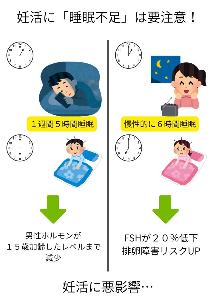 慢性的に6時間程度しか眠れていない状態が続くと、FSHの値が20%低下し、排卵障害のリスクが高まることが知られています。排卵が不安定になると、生理周期が不安定になるため妊娠のタイミングを逃しやすくなり、自然妊活にとって大きな障害となります。さらに、睡眠不足はストレスホルモンの分泌を増やし、自律神経の乱れを引き起こすため、月経周期にも影響を及ぼす可能性があります。