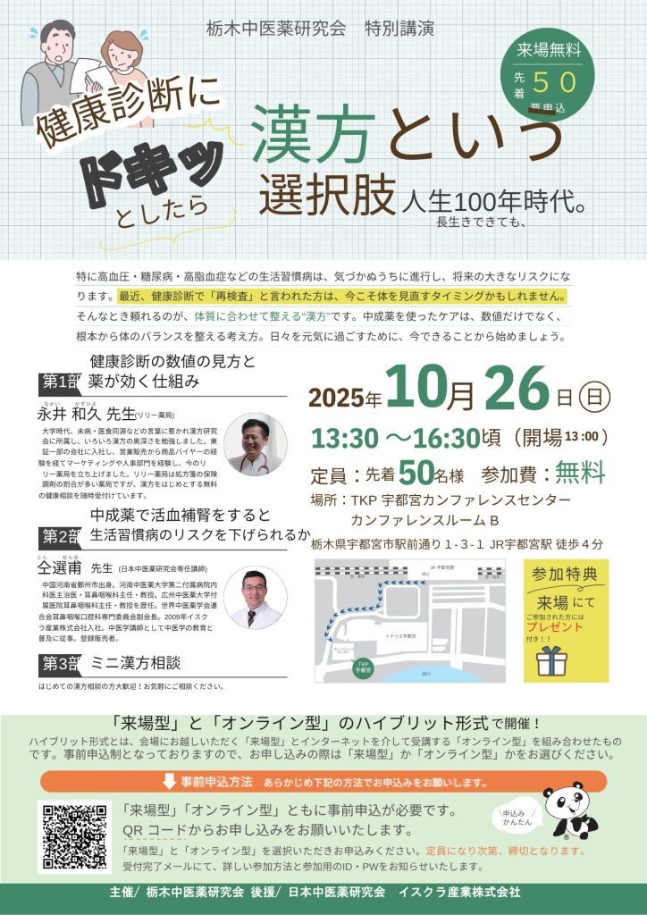 栃木中医薬研究会主催の特別講演会が開催されます。